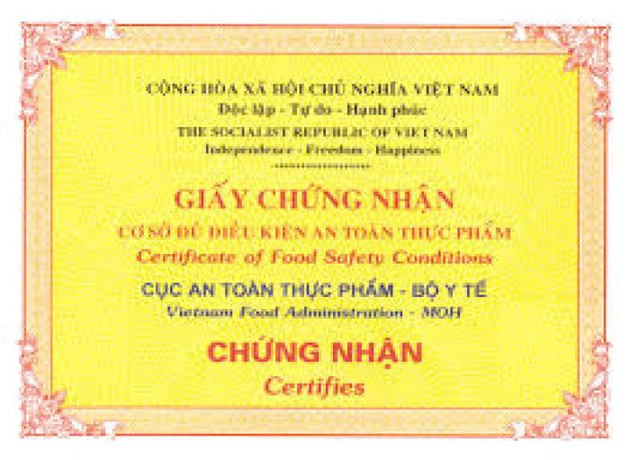 Chứng nhận an toàn thực phẩm Đạt tiêu chuẩn VSATTP